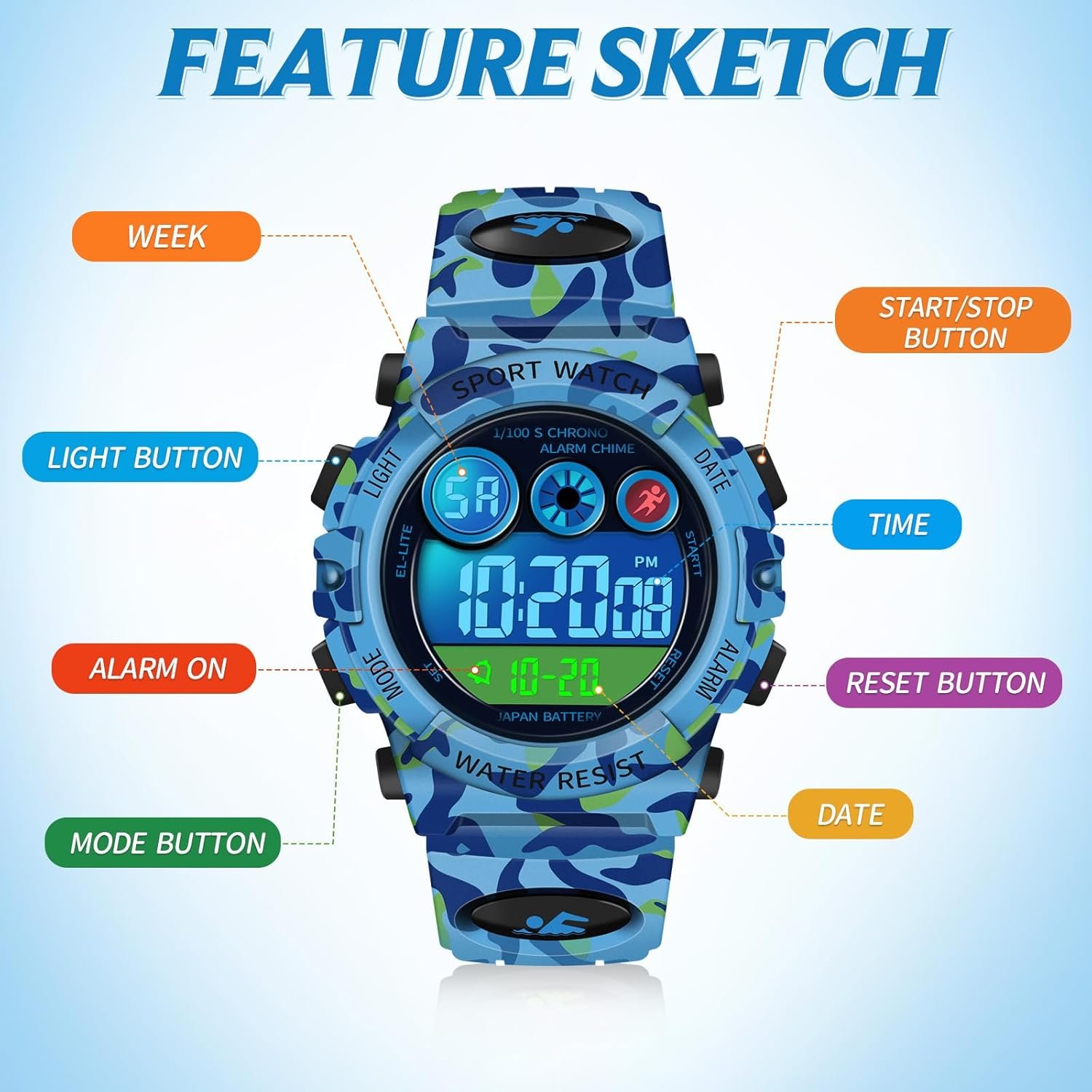 • Kids Sports Watch Waterproof Boys Multi-Function Digital Wristwatch LED Alarm Stopwatch